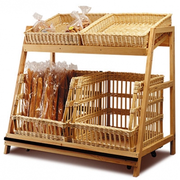 Structure sapin, verni alimentaire, corbeilles en osier naturel, chariot sur roulettes pivotantes avec bandeau de protection, Chargement avant ou arrière